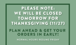 We will be CLOSED on 11/27 for Thanksgiving and will reopen at 10am on 11/28.